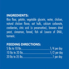 Rice Flour, Gelatin, Vegetable Glycerin, Water, Chicken, Natural Chicken Flavor, Oat Fiber, Calcium Carbonate, Cranberries, Citric Acid (A Preservative), Brewers Dried Yeast, Cinnamon, Fennel, Algae Meal, Turmeric.